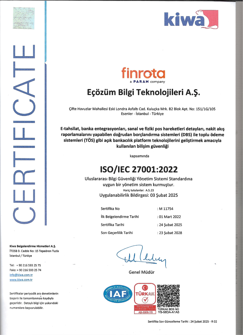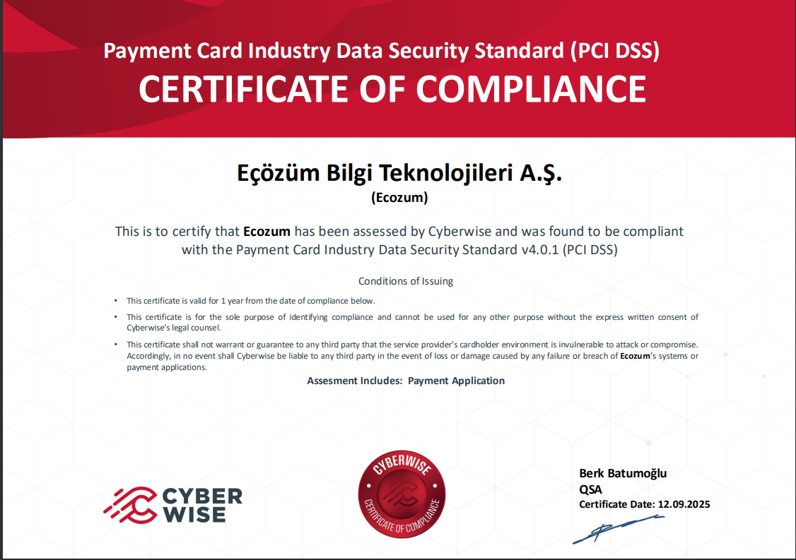 Kredi kartı bilgilerinin güvenliği için TLS ECC 256 bit sertifika ve AES 256 Bit key kullanılmakta, ödeme ve tahsilat işlemleri 3D secure özelliği ile güvenli bir şekilde gerçekleştirilebilmektedir. Yazılımların çalıştığı donanımlar 3 katmanlı güvenlik sistemleriyle korunmakta ve 3 katmanlı yedekleme yapılmaktadır.